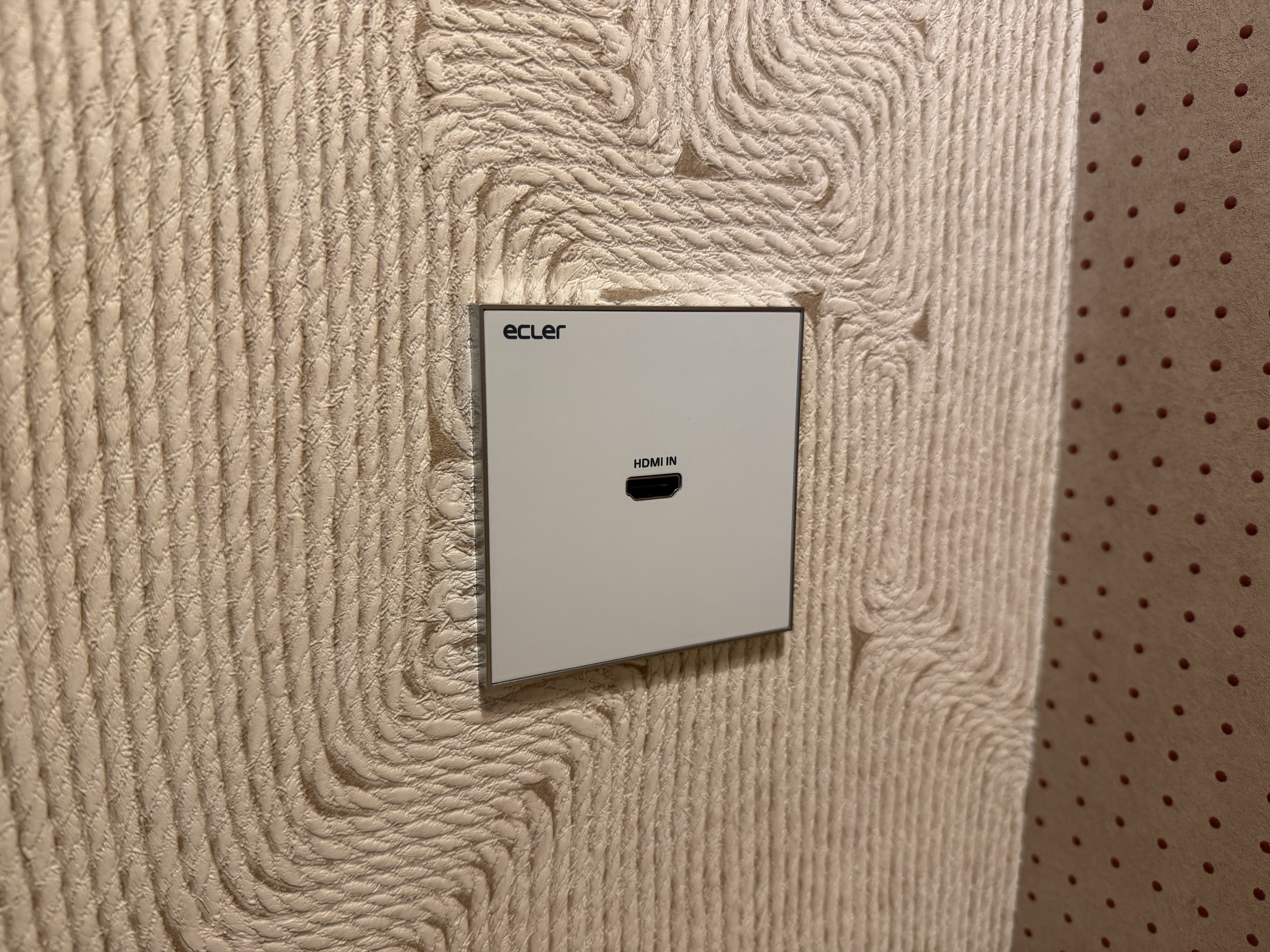 Naast de standaard videobronnen hebben we twee design HDMI-inputpanelen toegevoegd. Deze panelen zijn strak weggewerkt in standaard inbouwdozen en aangesloten via UTP-kabels. Ze sluiten esthetisch perfect aan bij het interieur van de zaal en maken het eenvoudig om presentaties of andere content direct weer te geven.