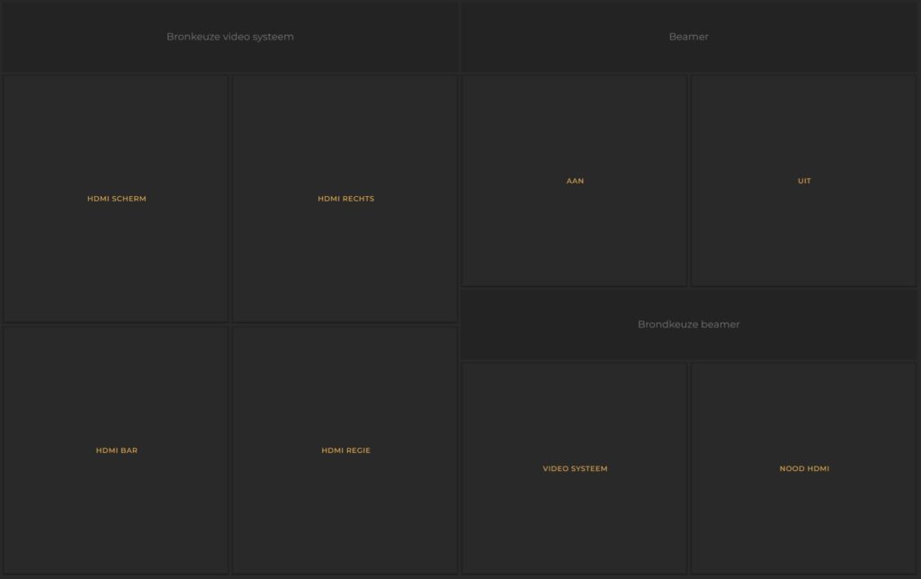 Door het toevoegen van een Ecler controllerbox wordt het systeem centraal aangestuurd via een tabletinterface. Gebruikers kunnen hiermee niet alleen de gewenste videobron selecteren, maar ook de projector in- en uitschakelen — alles overzichtelijk binnen één gebruiksvriendelijke bediening.